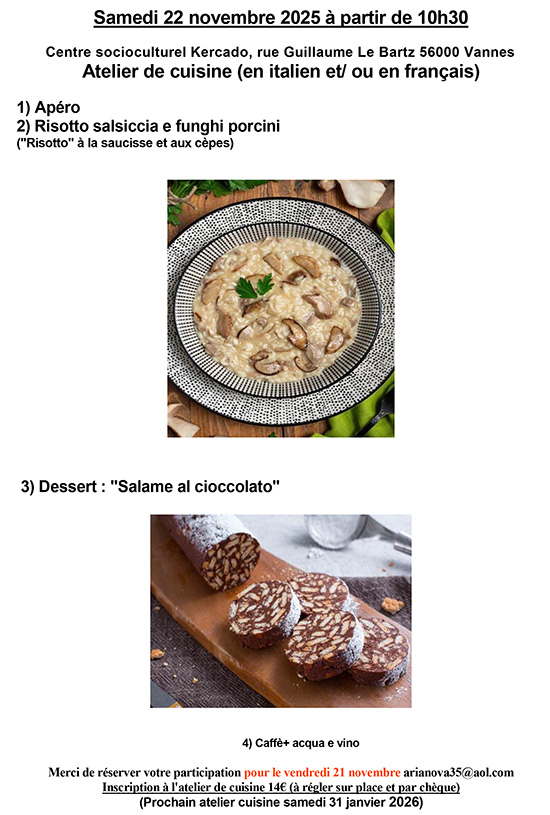 A sistra (titoli scorrevoli) Vannes A la Maison des Associations, 31 rue Guillaume Le Bartz : "Conversiamo ;;; in italiano" en 2025 les mercredis de 16h30 à 18h00 le 08 octobre et le 10 décembre / Café littéraire en 2025 le mercredi 12 novembre. Nous consulter pour les programmes