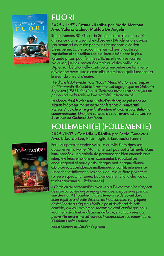 Rennes A la Maison Internationale, 7 quai Chateaubriand : "Chiacchieriamo ... in italiano" en 2025 les vendredis de 18h00 à 19h30 le 03 octobre, 21 novembre et 12 décembre / Apéro littéraire en 2025 les mercredis de 18h30 à 20h00 le 15 octobre, 05 novembre et 17 décembre. Nous consulter pour les programmes.