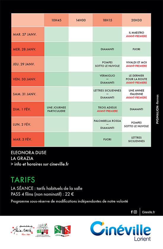 A sistra (titoli scorrevoli) Vannes A la Maison des Associations, 31 rue Guillaume Le Bartz : "Conversiamo ;;; in italiano" en 2025 les mercredis de 16h30 à 18h00 le 08 octobre et le 10 décembre / Café littéraire en 2025 le mercredi 12 novembre. Nous consulter pour les programmes